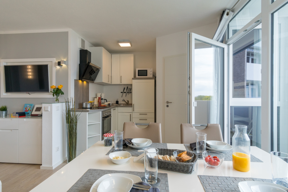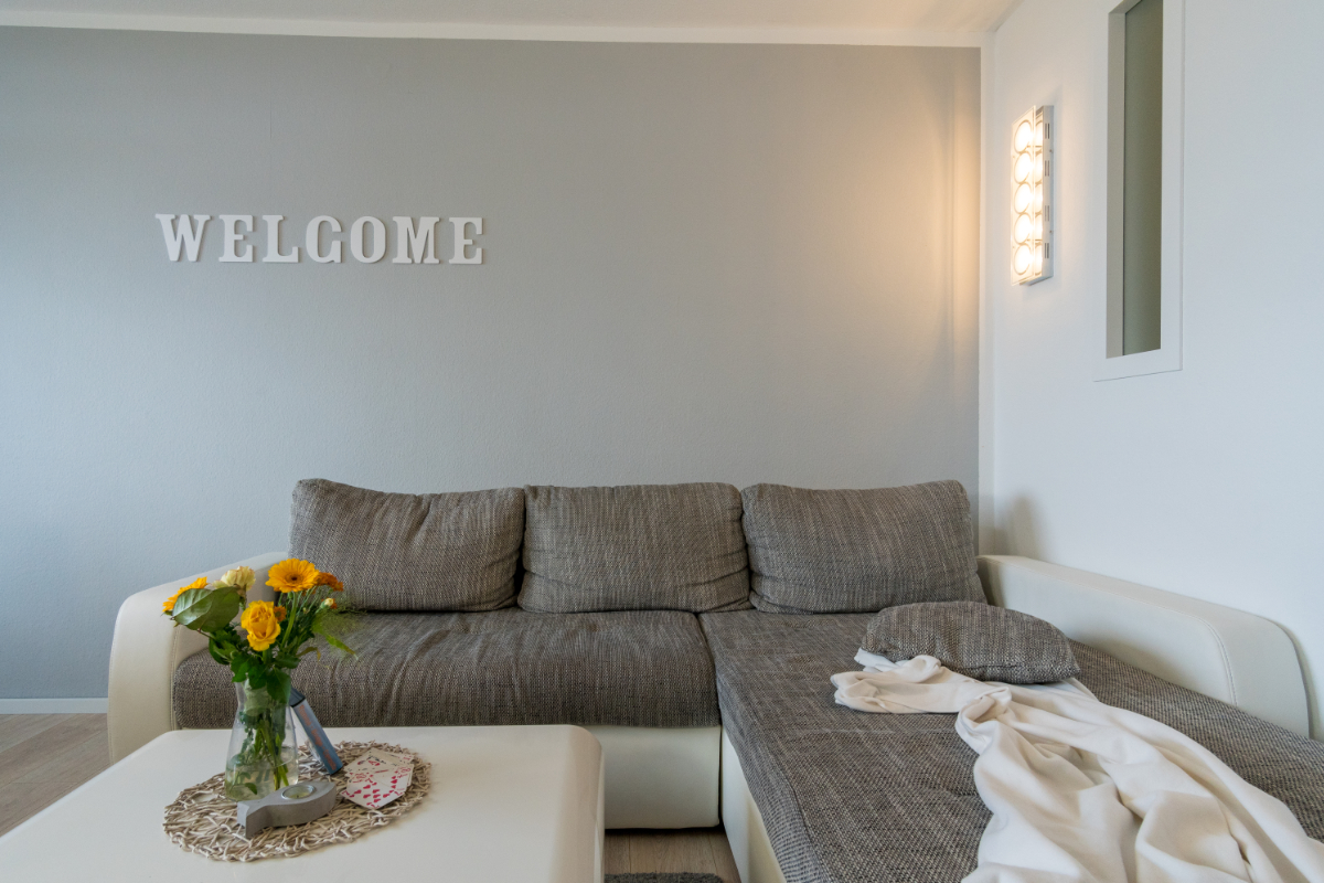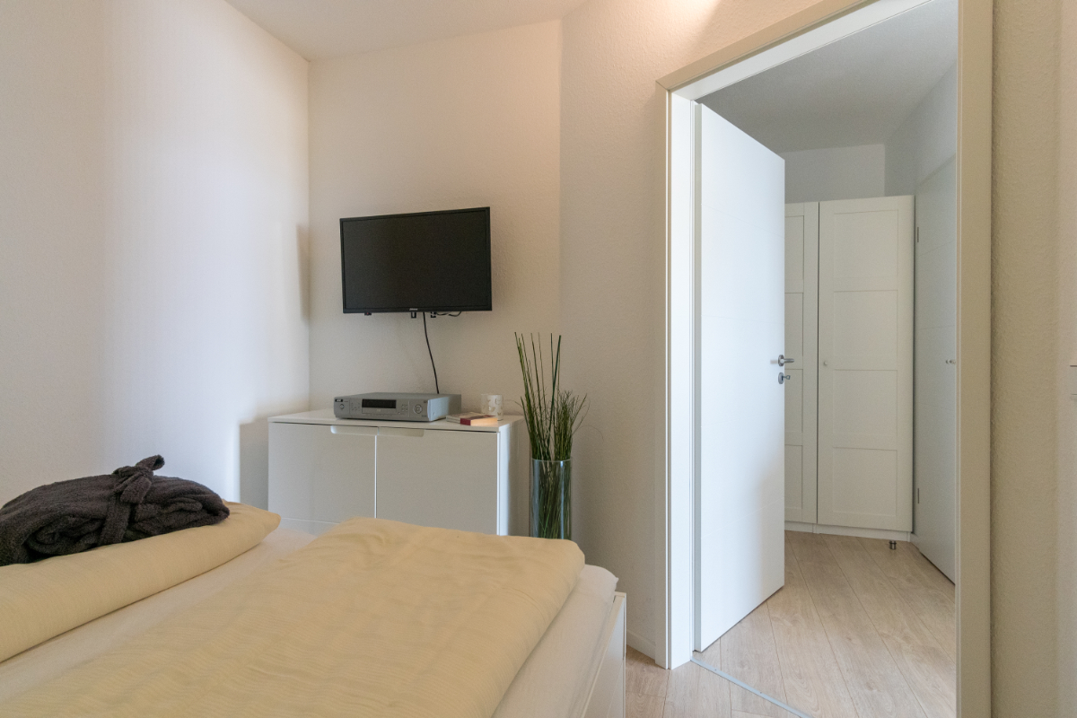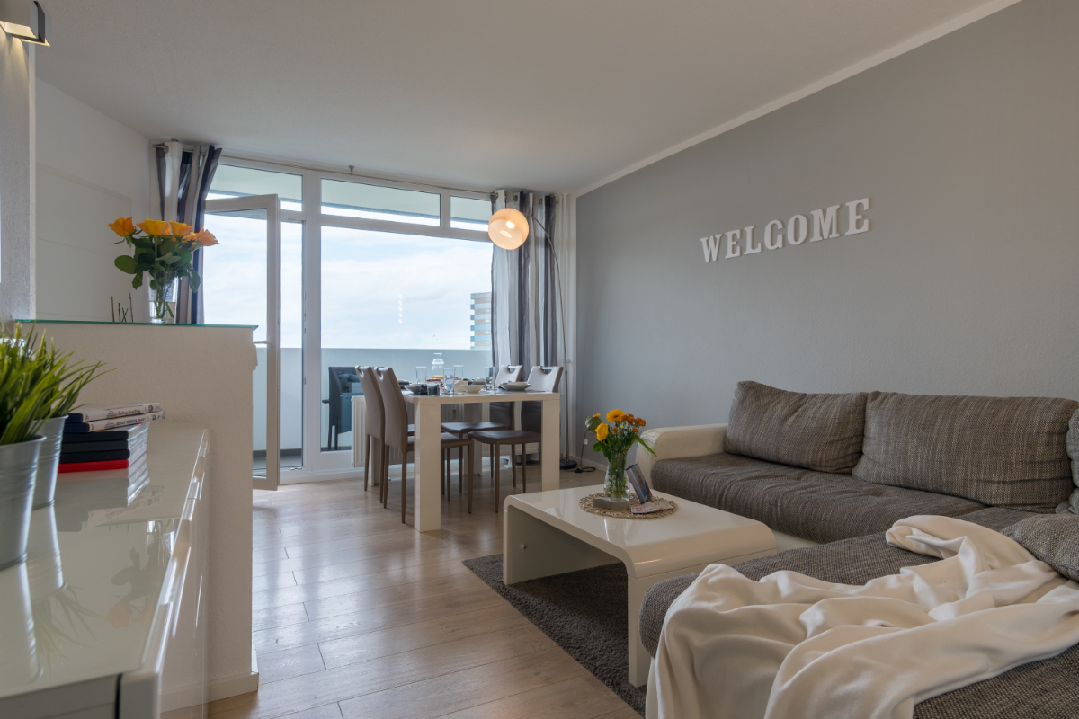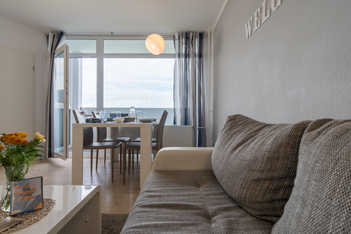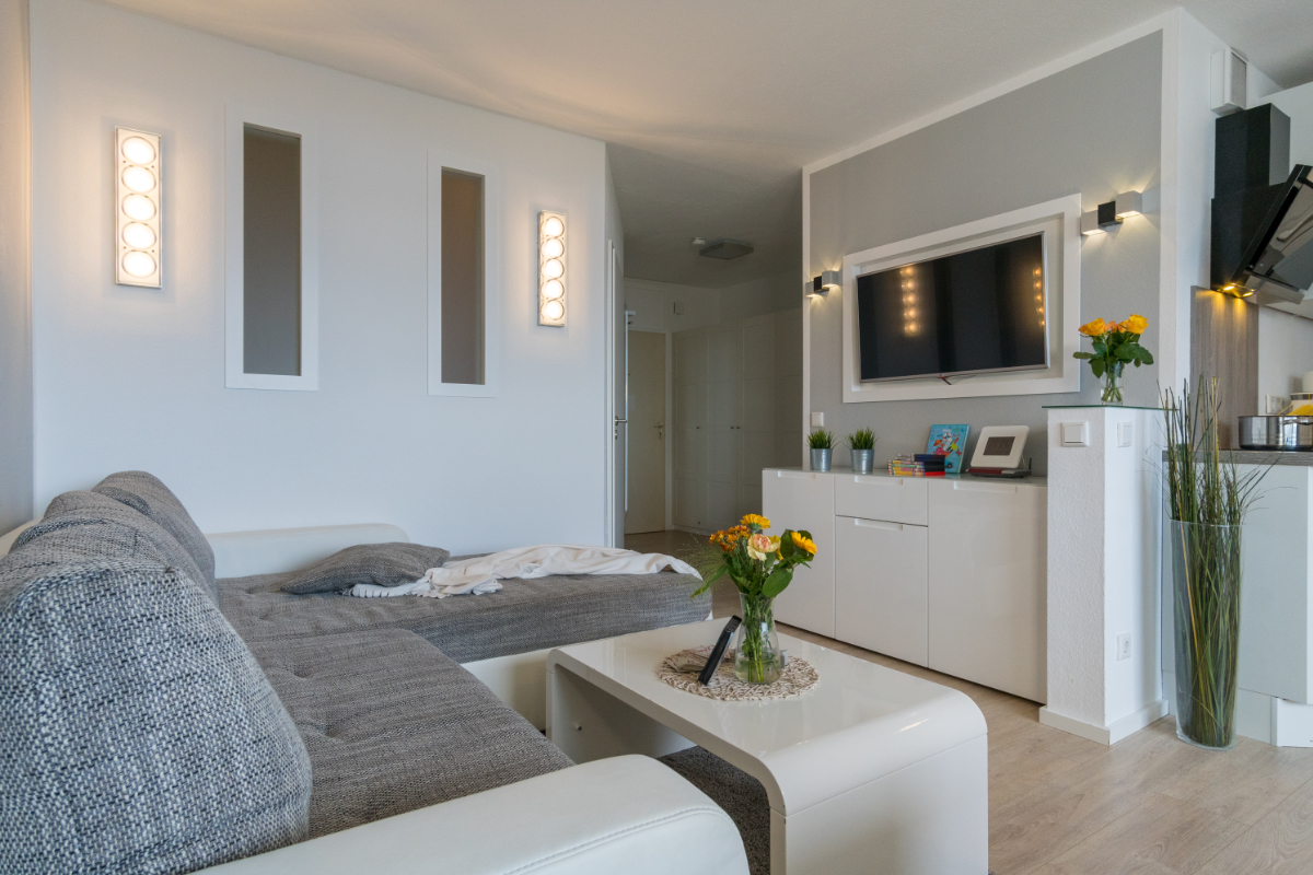 Die zuletzt 2021 modernisierte 45m²-Wohnung verfügt über einen großzügigen Wohnbereich mit einer gemütlichen Sofaecke mit Flatscreen-TV und der Essecke für vier Personen. Der offene Küchenbereich ist, für den Urlaubsbedarf, voll ausgestattet. Außerdem stehen Ihnen noch ein Backofen und ein Geschirrspüler zur Verfügung. Das angrenzende Kinderzimmer verfügt über ein Etagenbett und ist auch für Teenager geeignet. Das Elternschlafzimmer ist mit einem gemütlichen Doppelbett ausgestattet.
