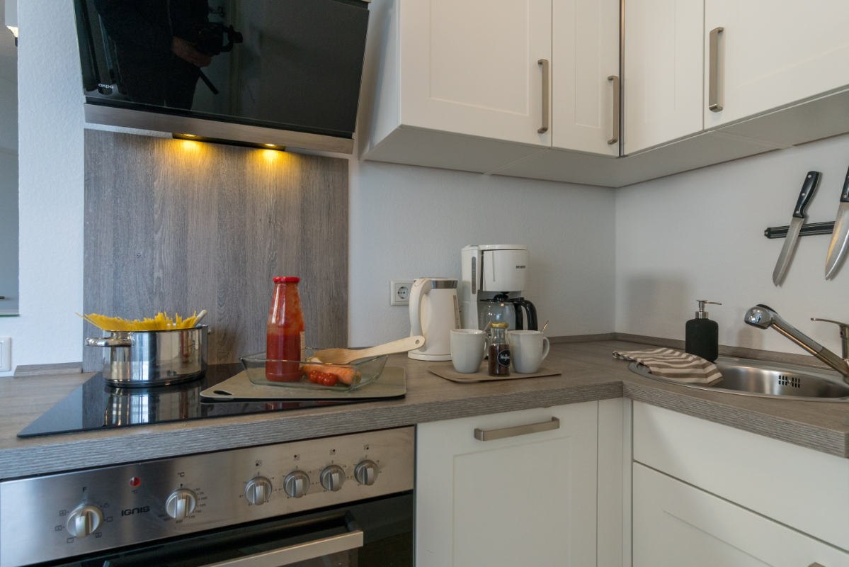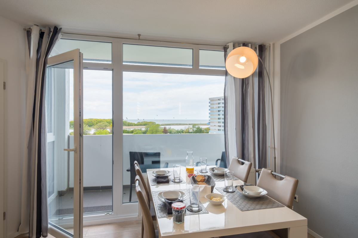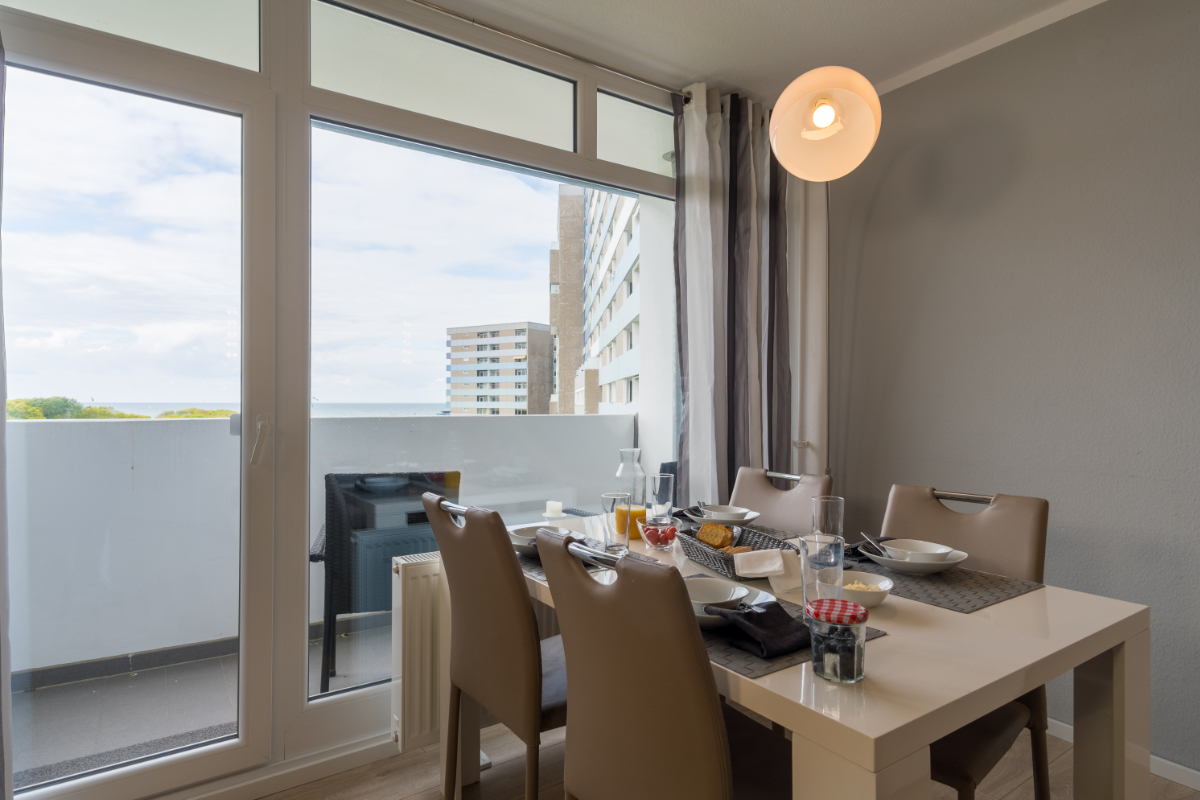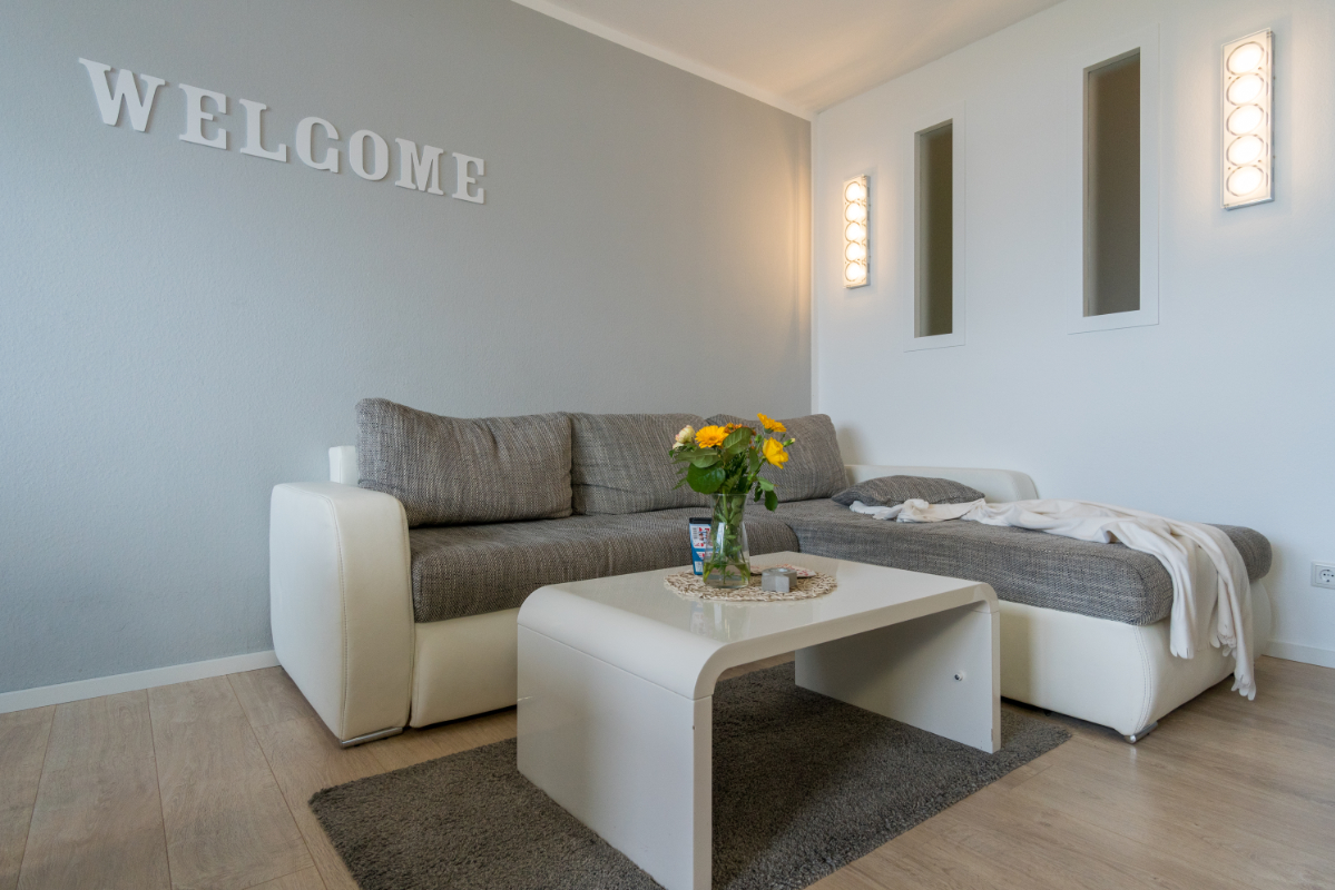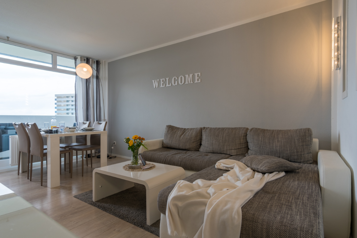 Die zuletzt 2021 modernisierte 45m²-Wohnung verfügt über einen großzügigen Wohnbereich mit einer gemütlichen Sofaecke mit Flatscreen-TV und der Essecke für vier Personen. Der offene Küchenbereich ist, für den Urlaubsbedarf, voll ausgestattet. Außerdem stehen Ihnen noch ein Backofen und ein Geschirrspüler zur Verfügung. Das angrenzende Kinderzimmer verfügt über ein Etagenbett und ist auch für Teenager geeignet. Das Elternschlafzimmer ist mit einem gemütlichen Doppelbett ausgestattet.