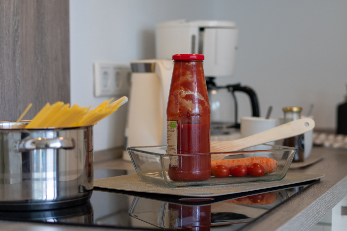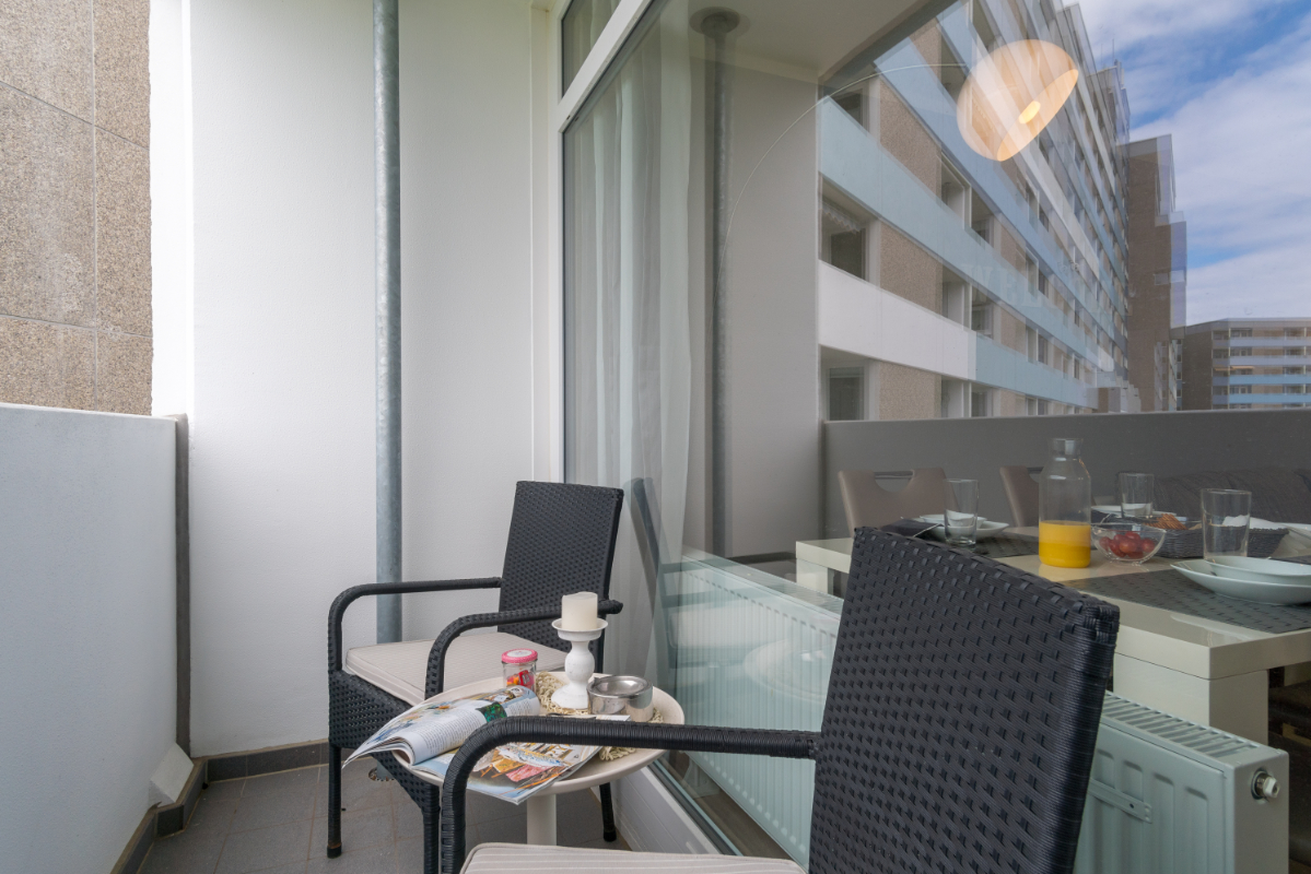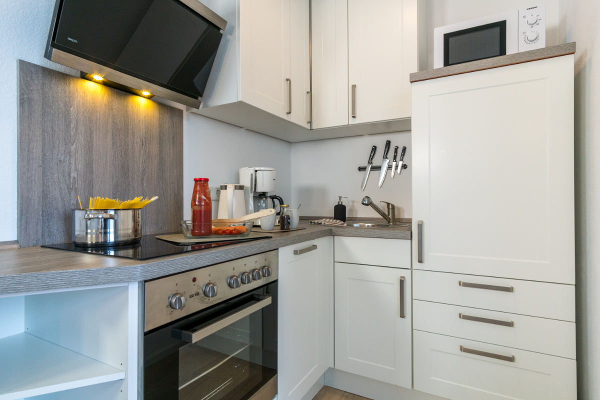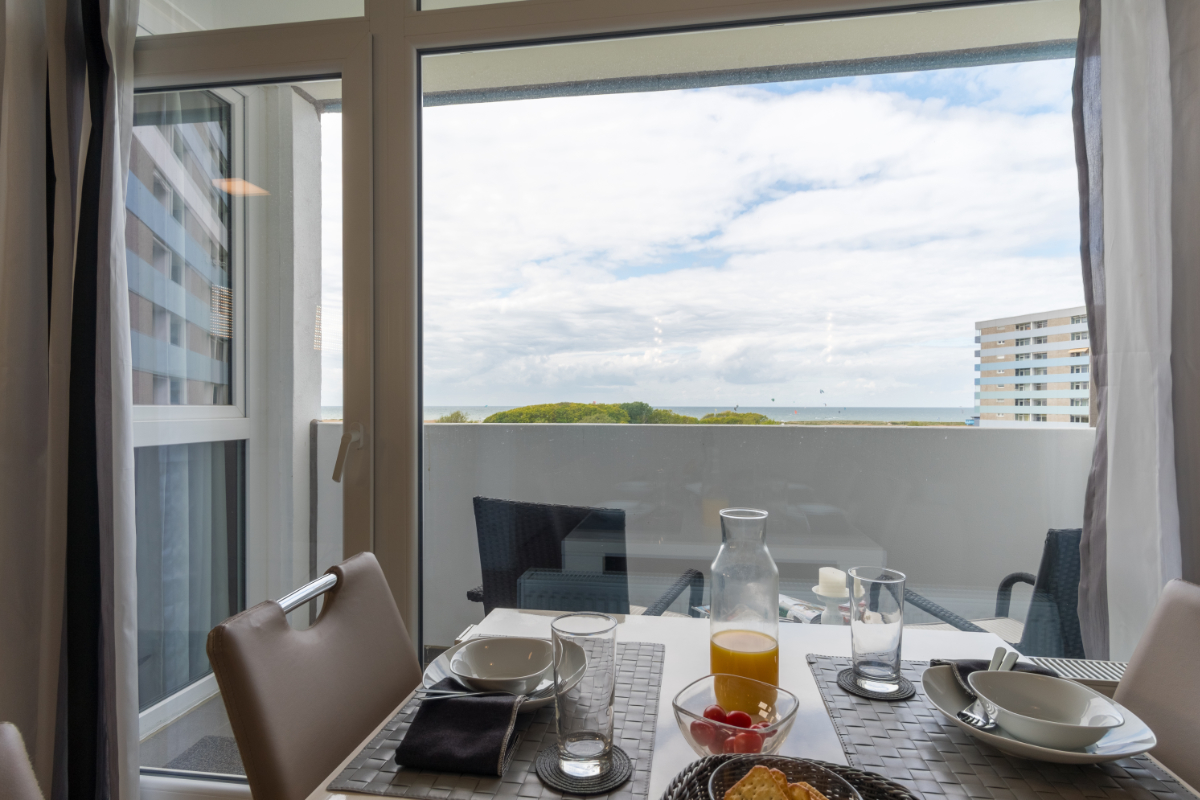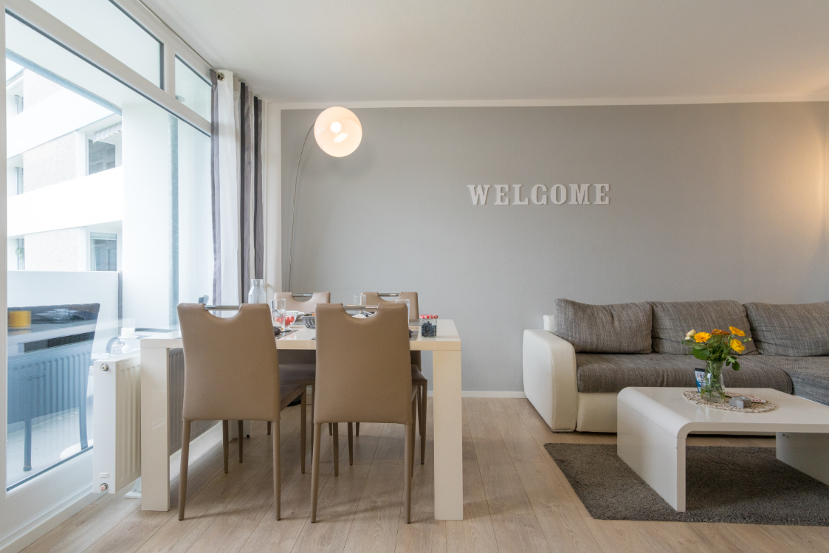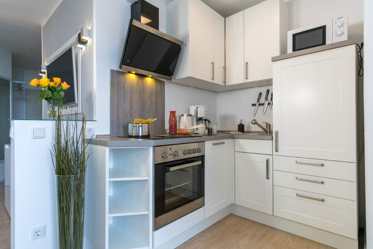 Die zuletzt 2021 modernisierte 45m²-Wohnung verfügt über einen großzügigen Wohnbereich mit einer gemütlichen Sofaecke mit Flatscreen-TV und der Essecke für vier Personen. Der offene Küchenbereich ist, für den Urlaubsbedarf, voll ausgestattet. Außerdem stehen Ihnen noch ein Backofen und ein Geschirrspüler zur Verfügung. Das angrenzende Kinderzimmer verfügt über ein Etagenbett und ist auch für Teenager geeignet. Das Elternschlafzimmer ist mit einem gemütlichen Doppelbett ausgestattet.