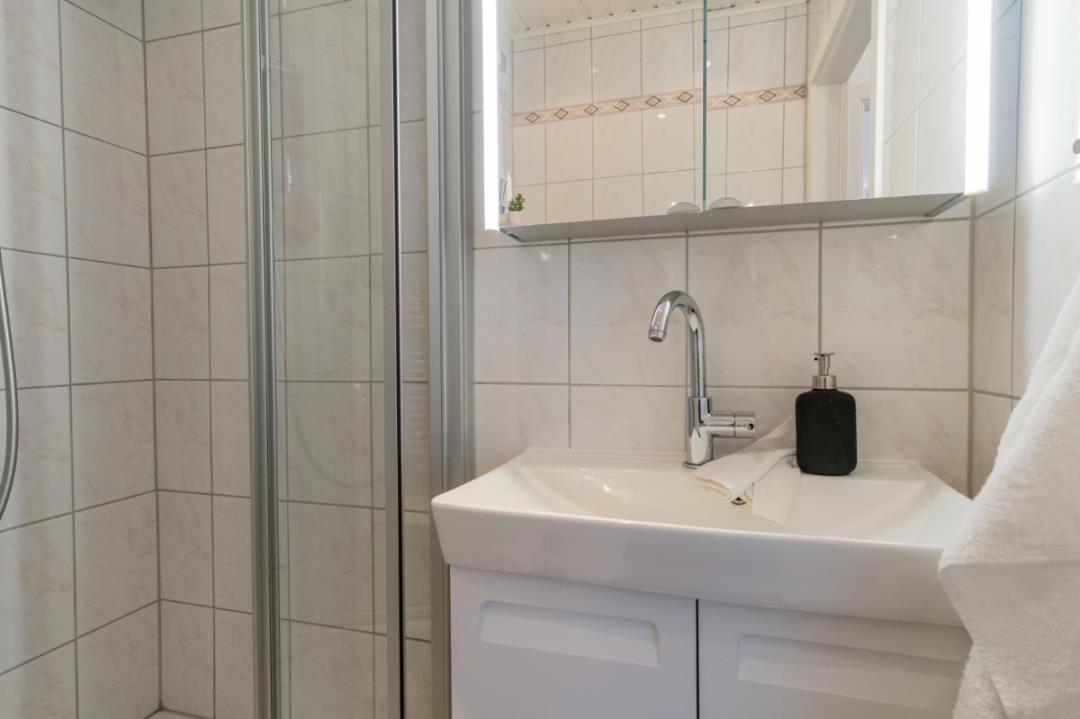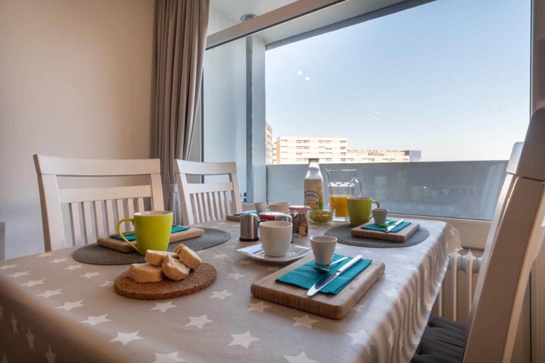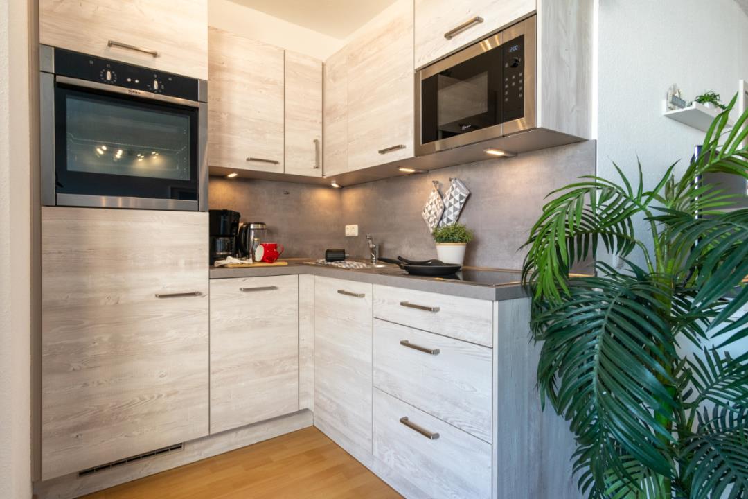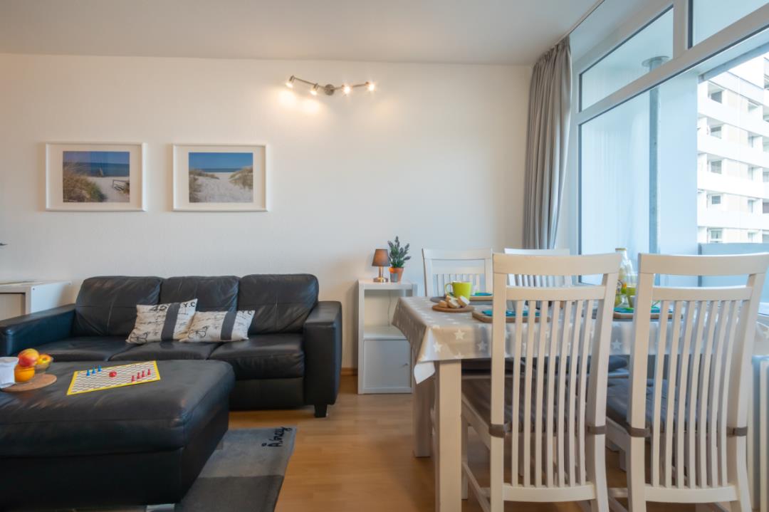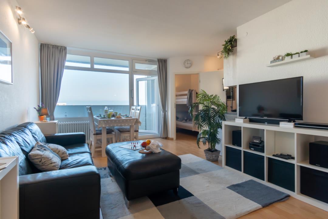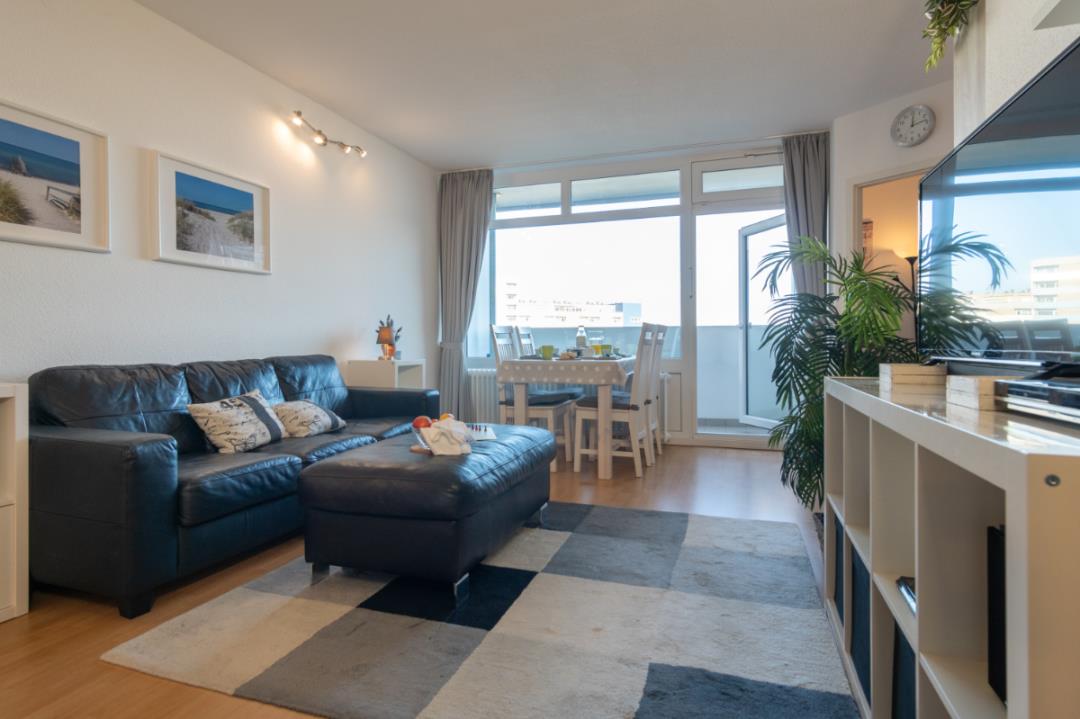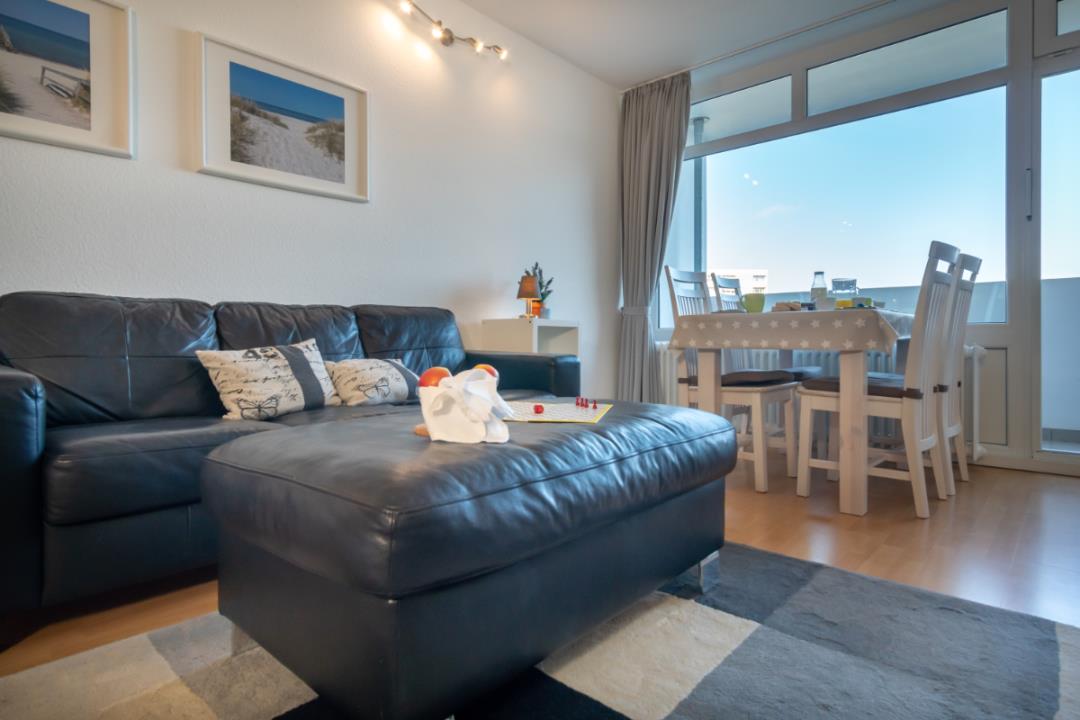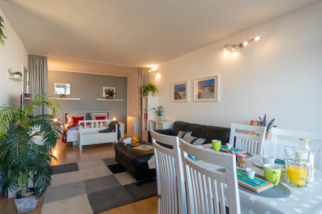 Die zuletzt 2021 modernisierte 45m²-Wohnung verfügt über einen großzügigen Wohn-Schlafbereich mit einem komfortablen Doppelbett (ca. 180*200cm) im hinteren Bereich, einer gemütlüchen Sofaecke mit Flatscreen-TV und der Essecke für vier Personen. Der offene Küchenbereich ist, für den Urlaubsbedarf, voll ausgestattet. Außerdem stehen Ihnen noch eine Waschmaschine, ein Backofen und ein Geschirrspüler zur Verfügung. Das angrenzende Kinderzimmer verfügt über ein Etagenbett und einen eigenen TV.