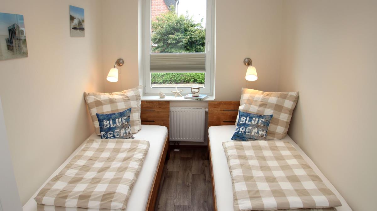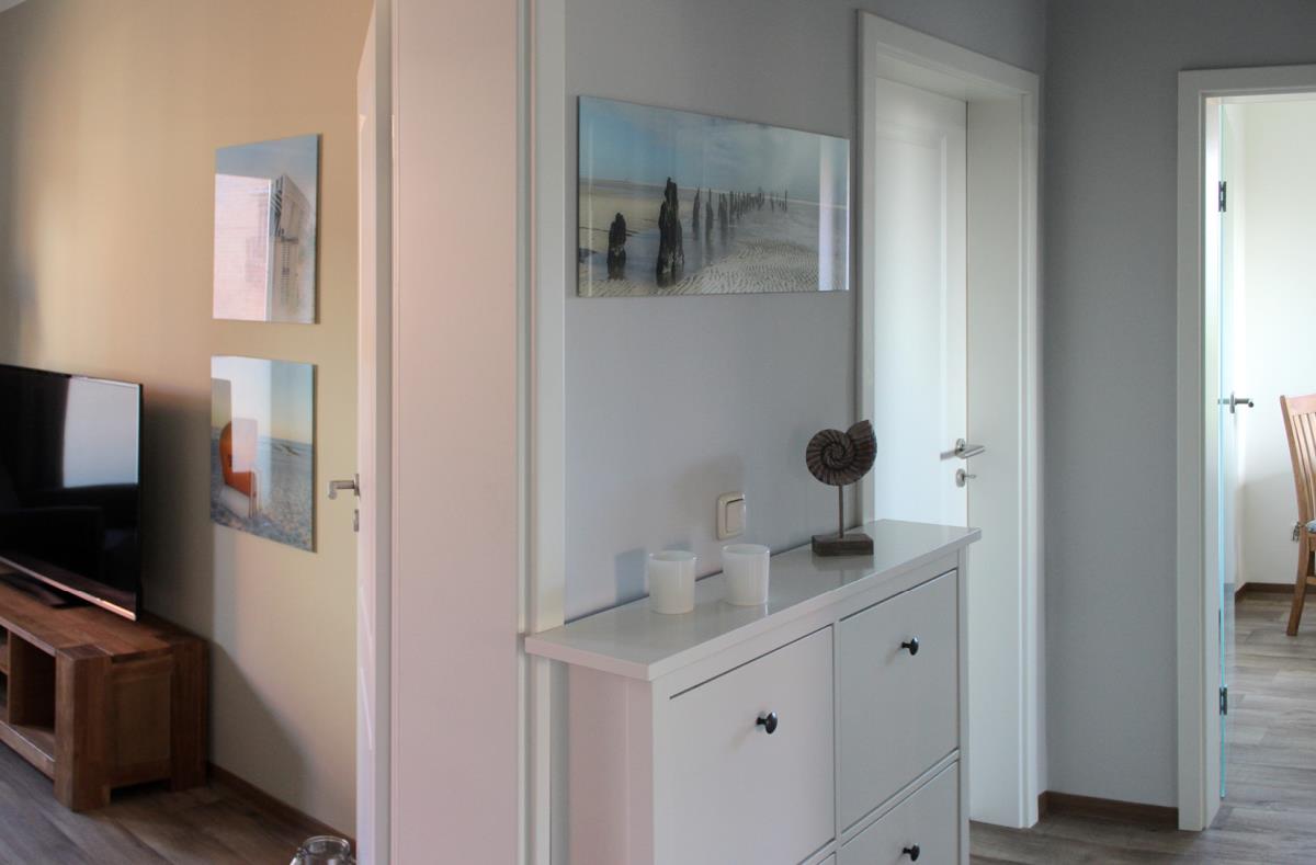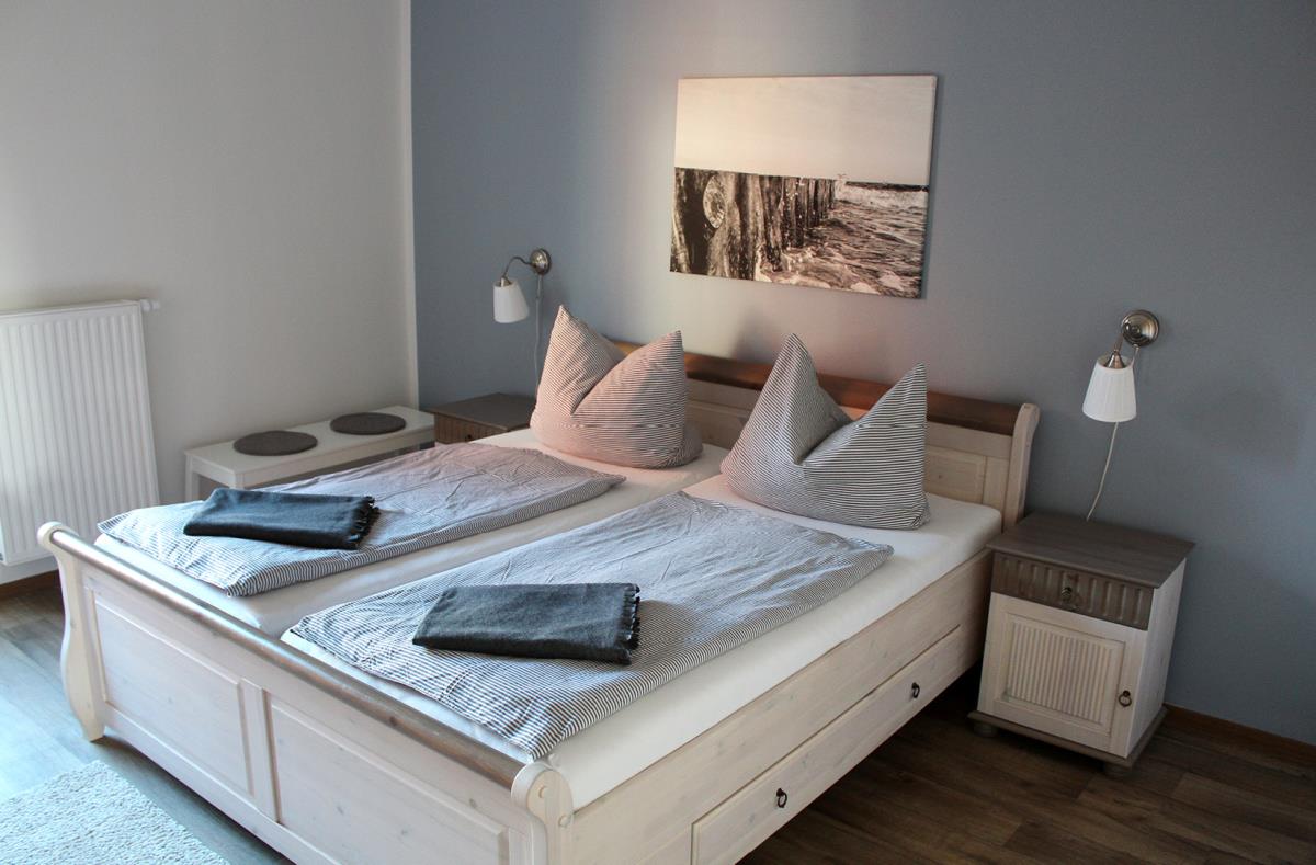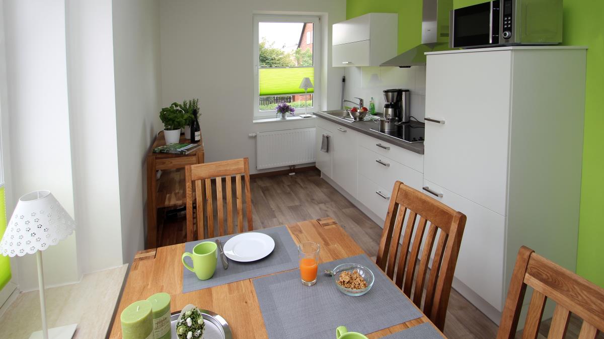 Die lichtdurchflutete Ferienwohnung Kormoran liegt im Hochparterre. Über das gemütlich eingerichtete Wohnzimmer mit Flatscreen, WLAN, großer Eckcouch und Fernsehsessel erreichen Sie den Balkon. Die geräumige Küche ist komplett ausgestattet mit Esstisch, Kühlschrank mit Gefrierfach, Geschirrspüler, Ceranfeld, Kaffeemaschine, Toaster und Wasserkocher, Hochstuhl. Durch die separaten Schlafmöglichkeiten bietet diese Wohnung viel Platz für bis zu 4 Gäste. Im großen Schlafzimmer mit Doppelbett, Kleiderschrank und zweitem TV bietet sich die Möglichkeit ein Babyreisebett aufzustellen. Mit Kleiderschrank und zwei Einzelbetten ist das zweite Schlafzimmer ausgestattet. Das Badezimmer mit Handtuchtrockner und Fön verfügt über ein Tageslichtfenster.